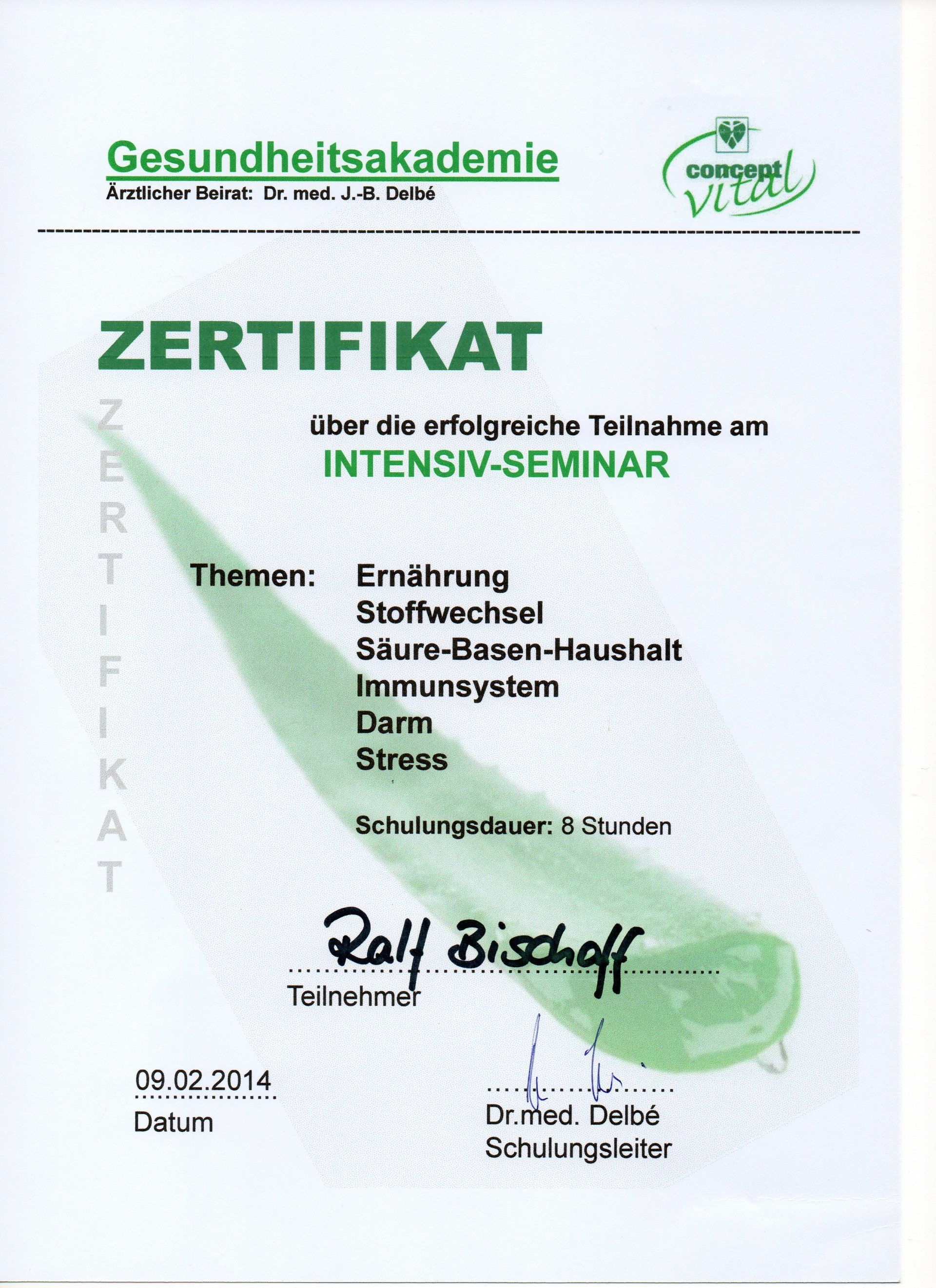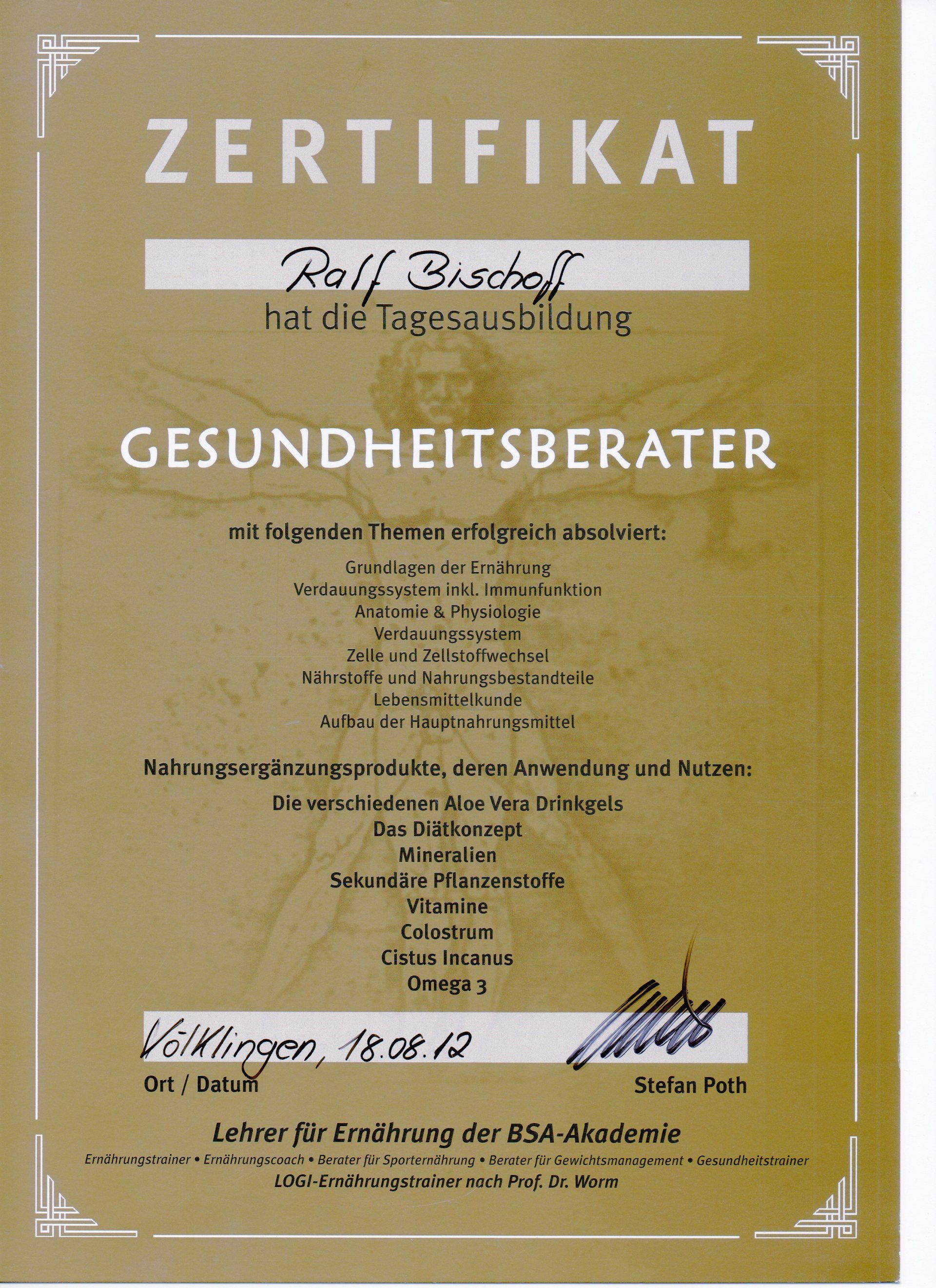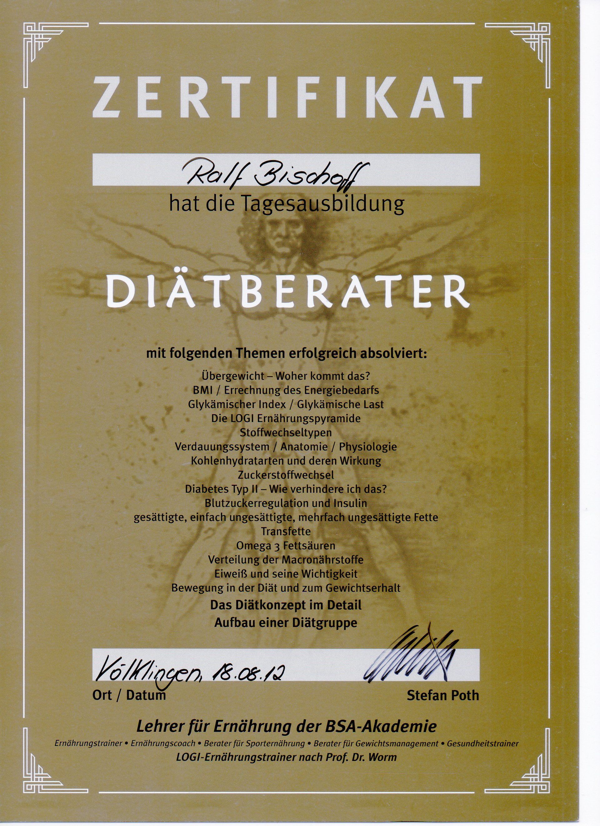 Zertifizierter Berater für Gesundheit, Ernährung, Diät, Prävention und Sekundärprävention.