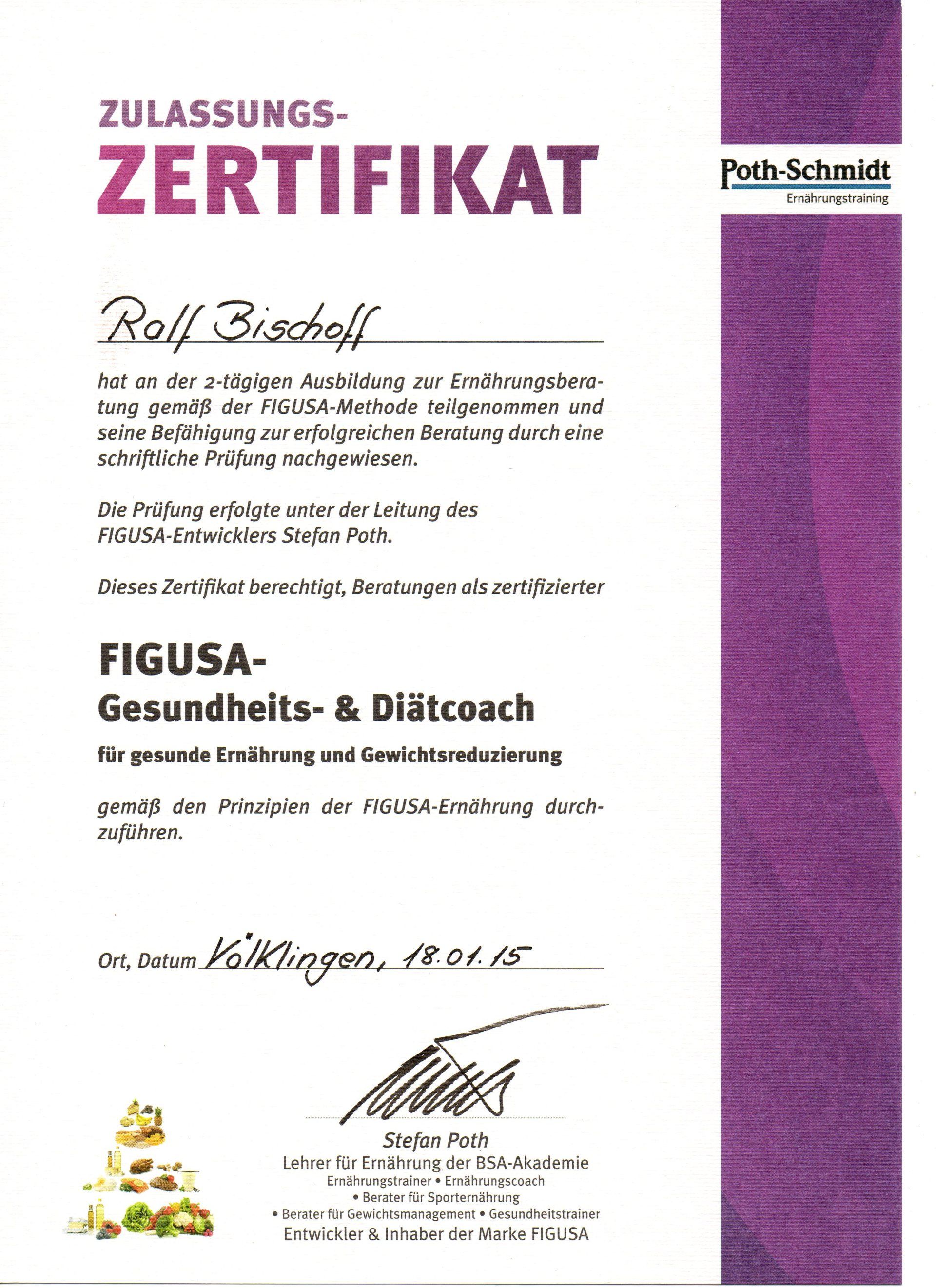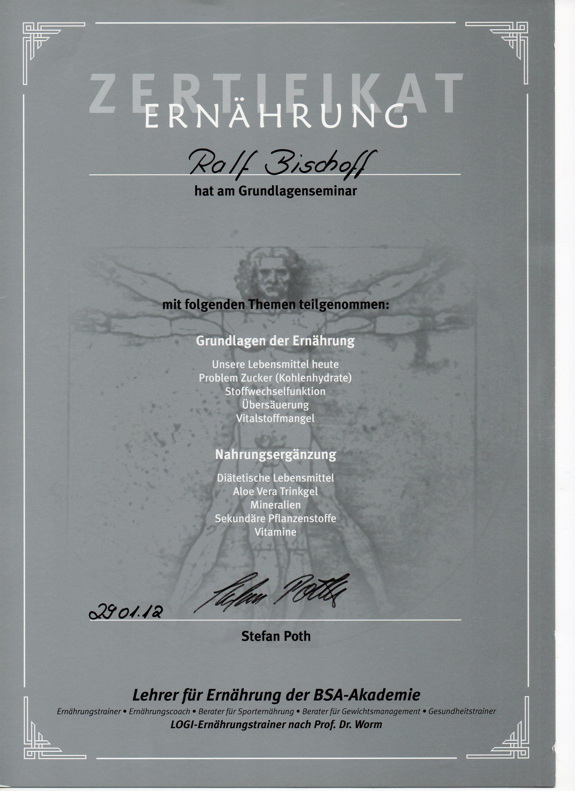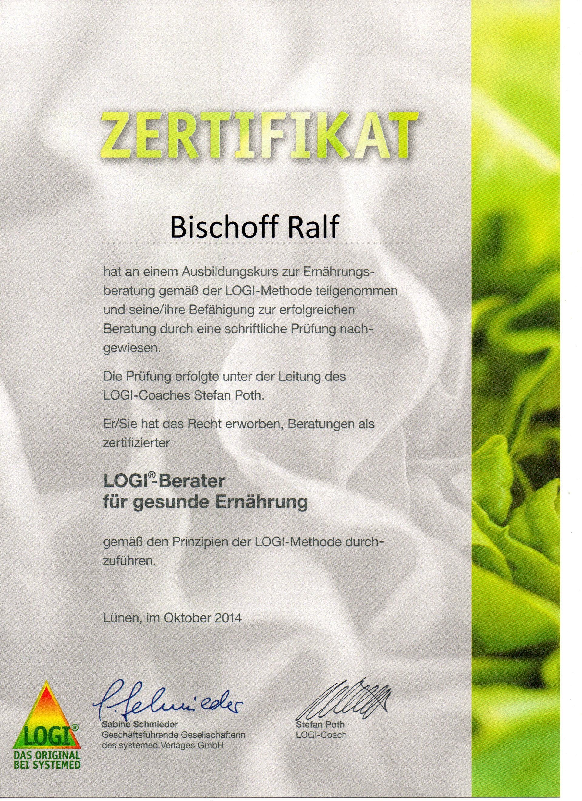 Zertifizierter Berater für Gesundheit, Ernährung, Diät, Prävention und Sekundärprävention.