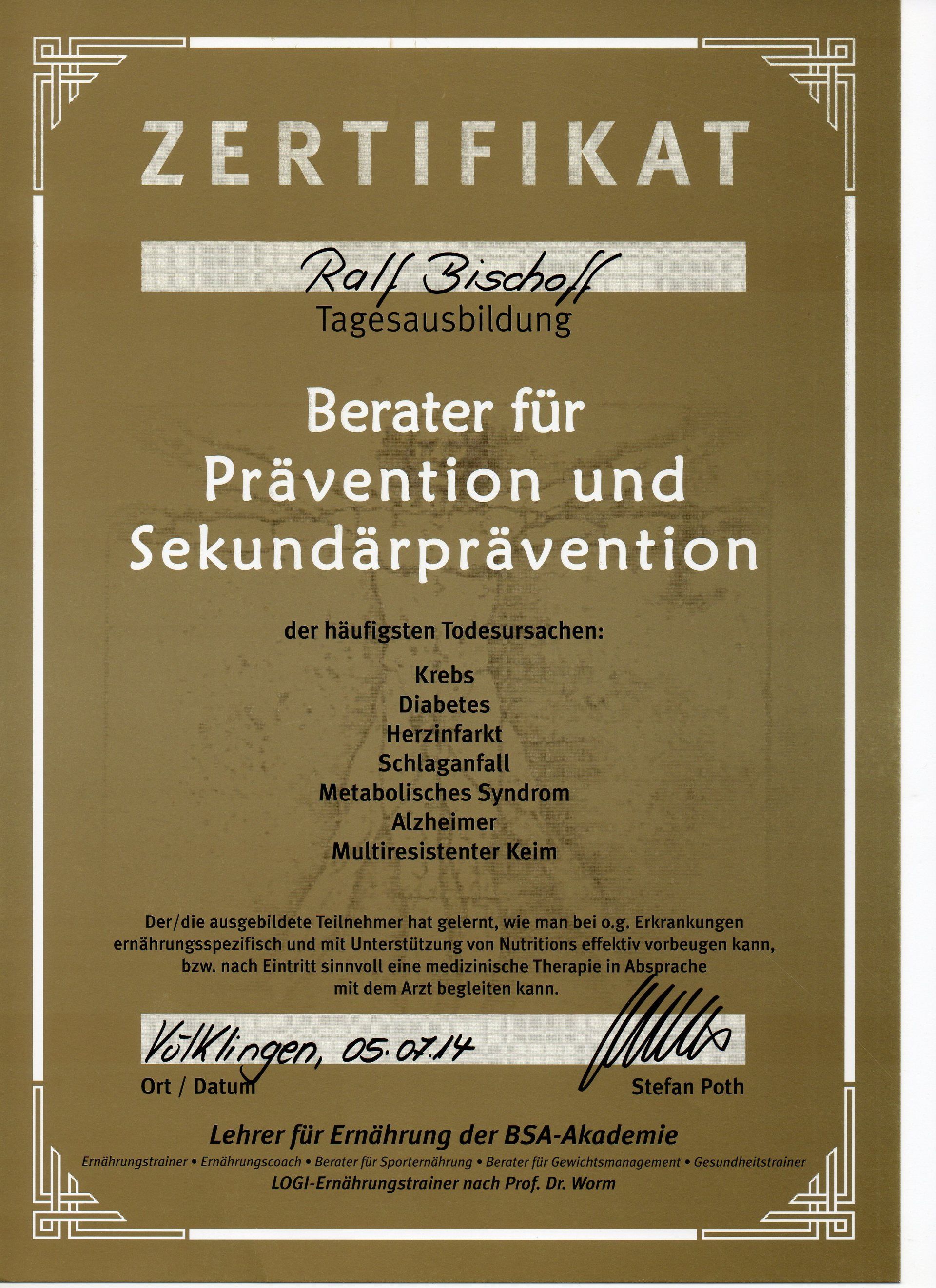 Zertifizierter Berater für Gesundheit, Ernährung, Diät, Prävention und Sekundärprävention.